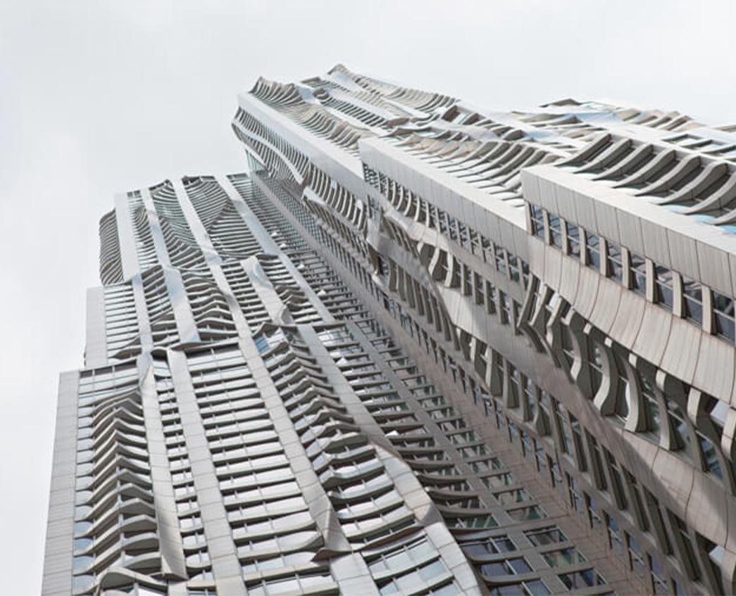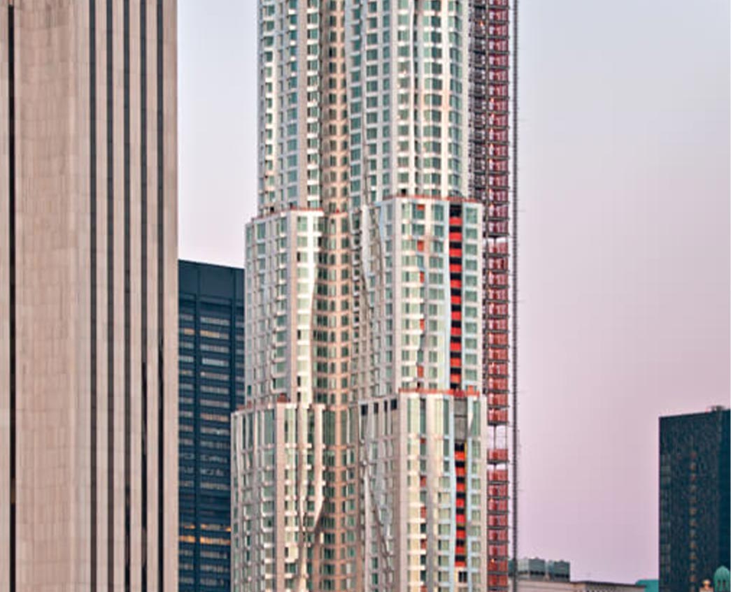 The remarkable wavy façade of Eight Spruce Street – a residential building in Lower Manhattan – rises high into the New York cityscape.